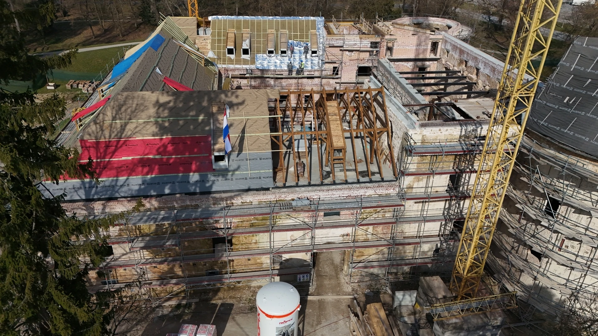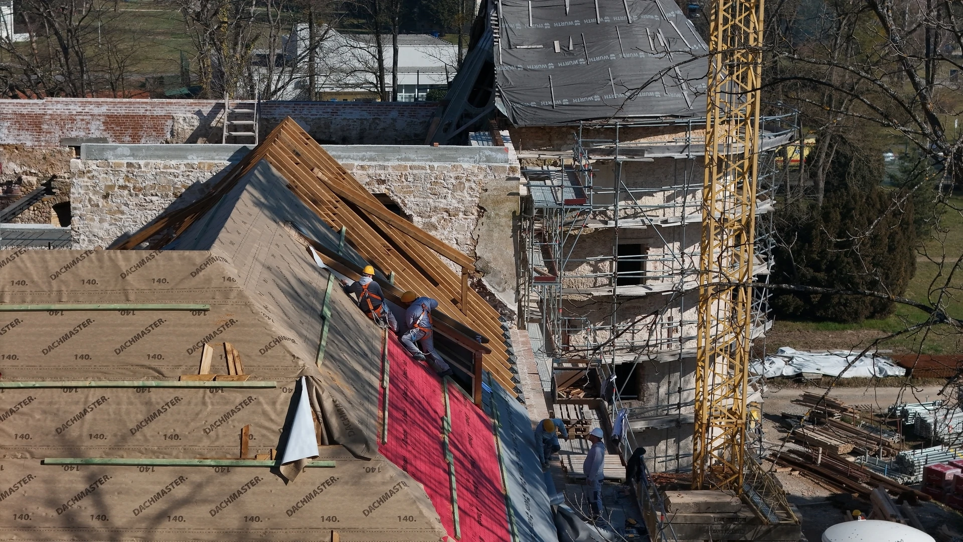 Trenutno su u tijeku radovi na postavi hrastove krovne konstrukcije, a već krajem ovog mjeseca započet će postavljanje crijepa, čime će dvorac konačno dobiti svoju zaštitu od vremenskih utjecaja i biti korak bliže konačnom završetku obnove.